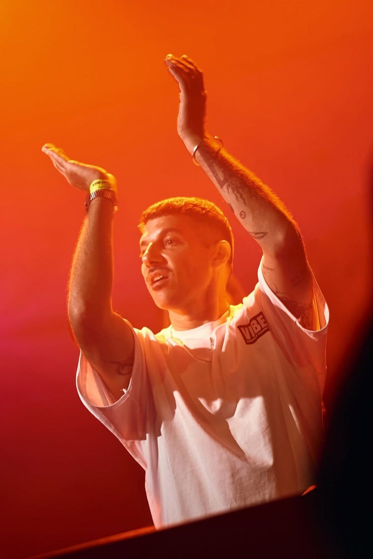 Camiseta blanca oversize unisex de manga corta con estampado dance en negro en la espalda y logo Andrés Campo x Vibewear, también en negro, en el pecho.